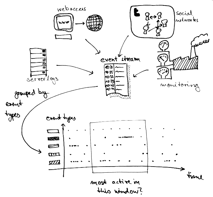 Such event streams usually contain an enormous amount of data, much too much for a single human being to grasp. As a first step, you're often interested in doing some kind of aggregation, extracting some basic statistics. For example: